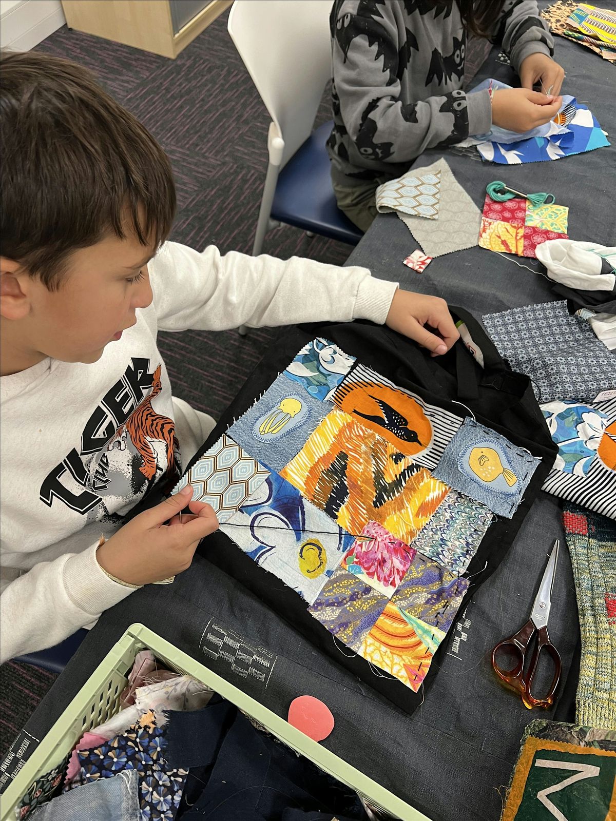 Join Fabric Folk for a relaxed Stitch With Your Kids workshop where you'll transform a simple tote bag into something unique using colourful fabric appliquΓ©.