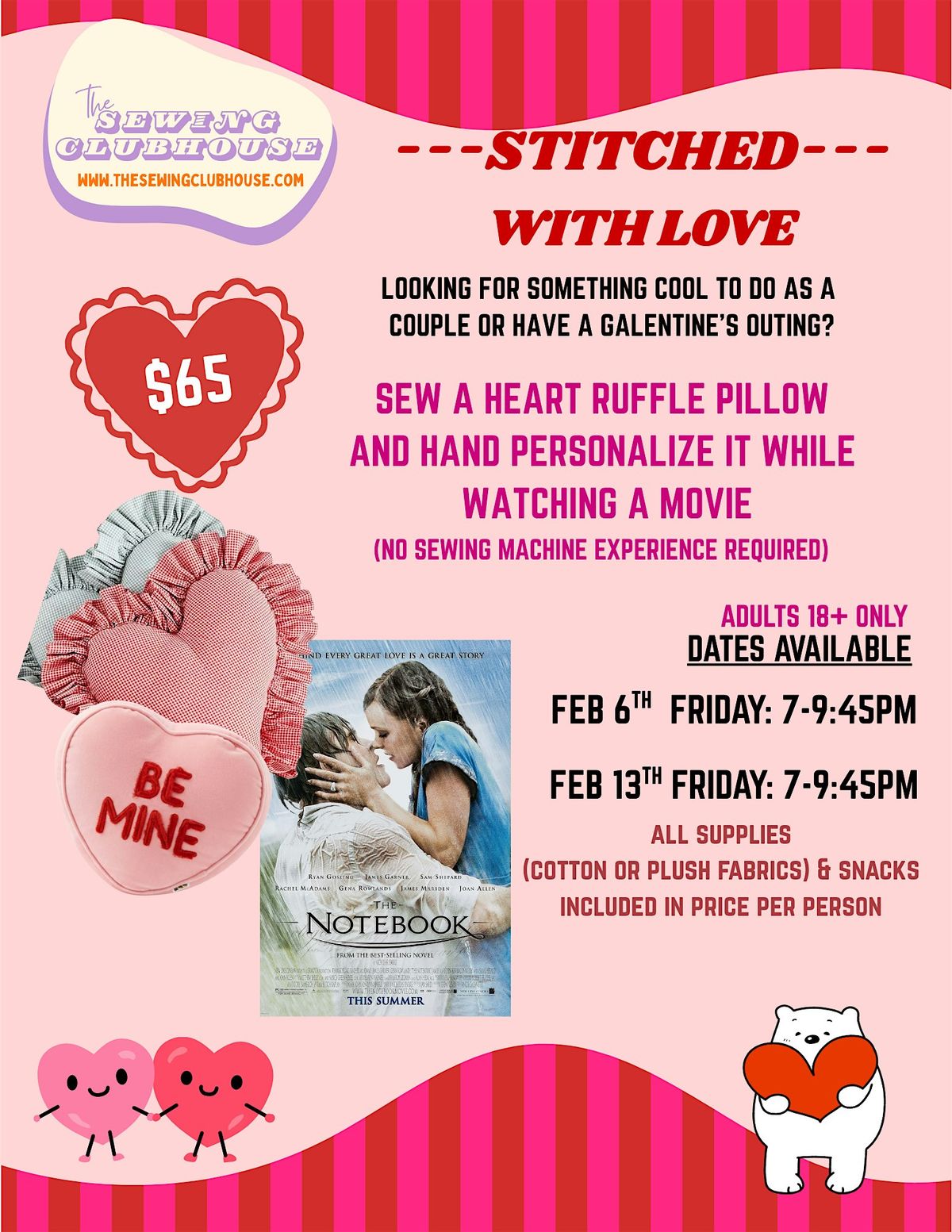 Looking for valentine's plans as a couple or for your gal pals? Come sew a personalized heart pillow while watching a movie
