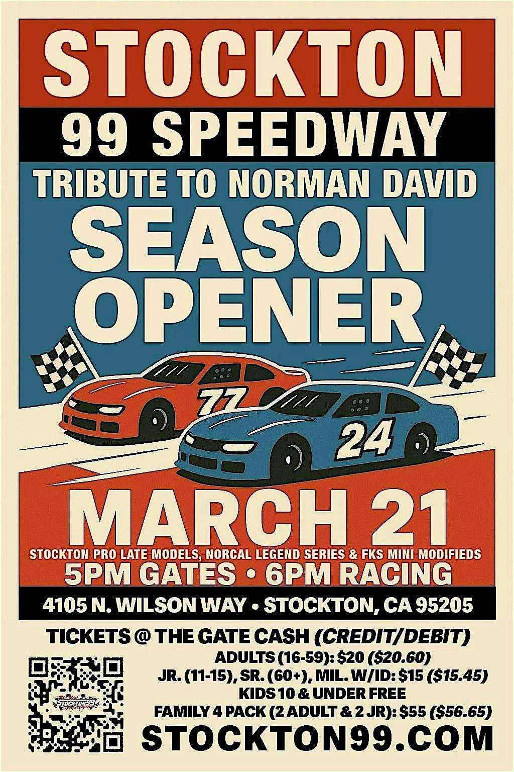 The 77th Season Opener roars to life at the historic Stockton 99 Speedway on Saturday, March 21st, honoring the legacy of Norman David with a night of pure short‑track adrenaline.
