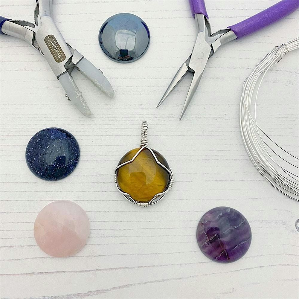 During this 2.5 hour class you’ll learn how to manipulate wire, in order to hold your chosen stone or Cabochon, ready to turn into a simple pendant. They’ll be plenty of time to practice the technique before using your newly leant skills to make your final pendant. We’ll have a selection of Semi-precious stone to work with and you’ll be able to discuss the the best ways to hold different shaped stones.