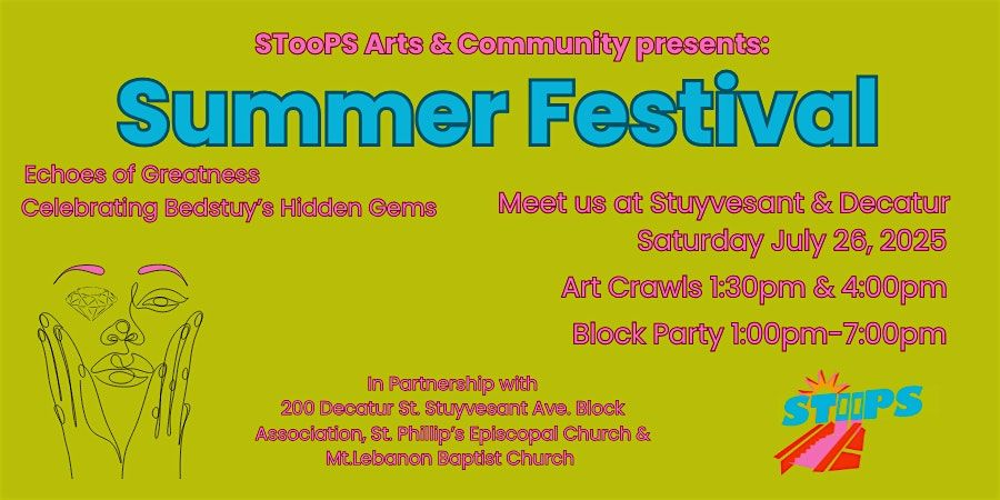We are partnering with the 200 Decatur St. Stuyvesant Ave. Block Association, St. Philip’s Episcopal Church & Mt. Lebanon Baptist Church to bring you this classic yet unique Summer Festival including a Block Party and Art Crawls.