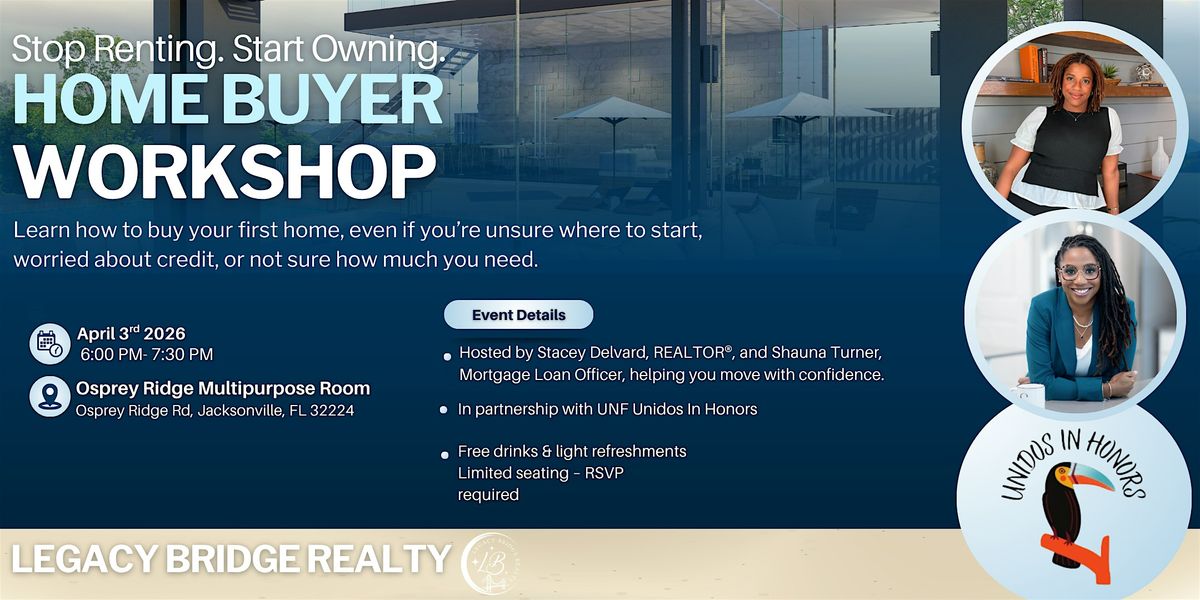 Ready to ditch renting and finally own your own place? Join us at UNF Osprey Ridge Road on April 3, 2026 at 6:00 PM (Eastern Time) for a laid-back workshop where we’ll cover all the basics of buying a home. Whether you're a first-timer or just need a refresher, this event is all about making homeownership easy and fun. Don’t miss out on tips, tricks, and answers to your burning questions!