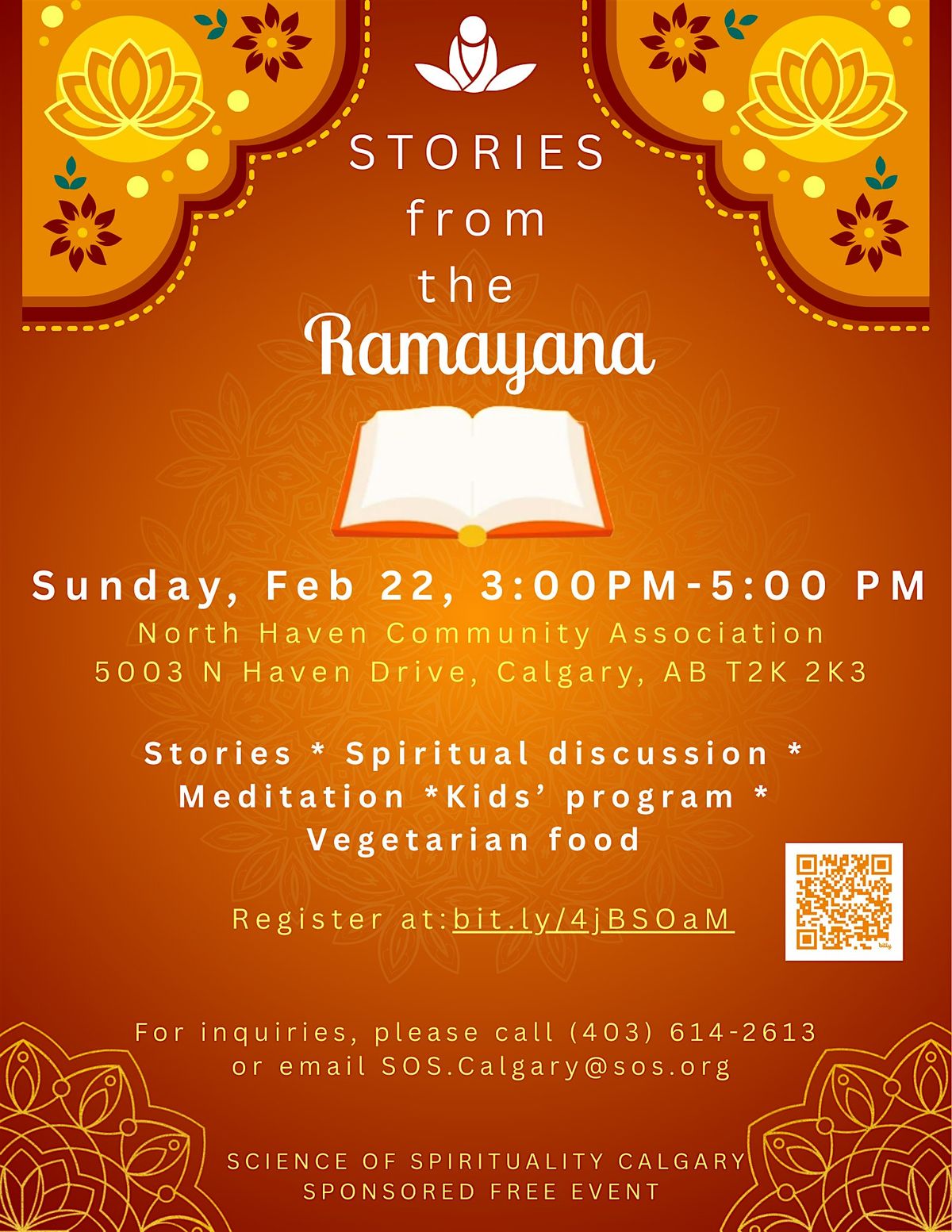Info: Program for adults will entail retelling of stories from the great epic Ramayana followed with a brief meditation session. Kids will concurrently be engaged in age-appropriate value-based stories, crafts, play, singing, and meditation. Complimentary vegetarian food follows the program.