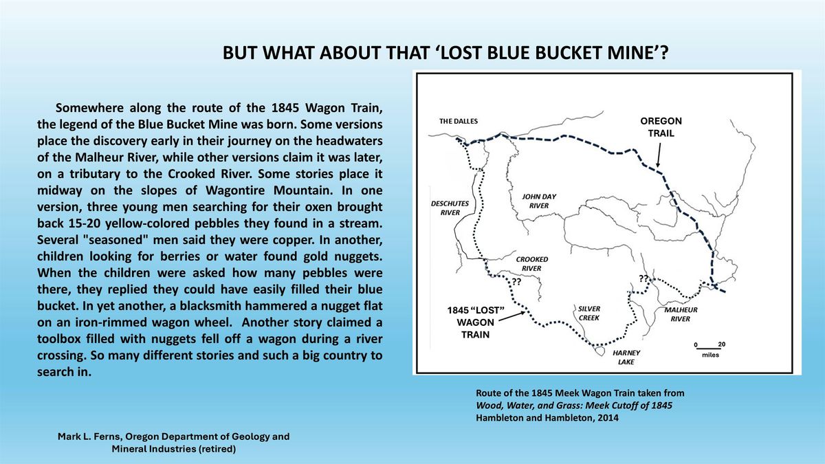 Geologist Mark Ferns will trace the interesting history of gold discoveries in Oregon. A history of the who's, where's, and when's of Oregon's gold discoveries are gleaned from news reports, letters, diaries, and publications in addition to the author's personal experiences. The story begins on the Siskiyou Trail with James Dana in 1841 and proceeds through the 1845 Lost Wagon Train to the early discoveries in Southwest and Northeast Oregon in the 1850's and 1860's. Simplified geology maps, photographs, and stories of later discoveries will take you into current day.