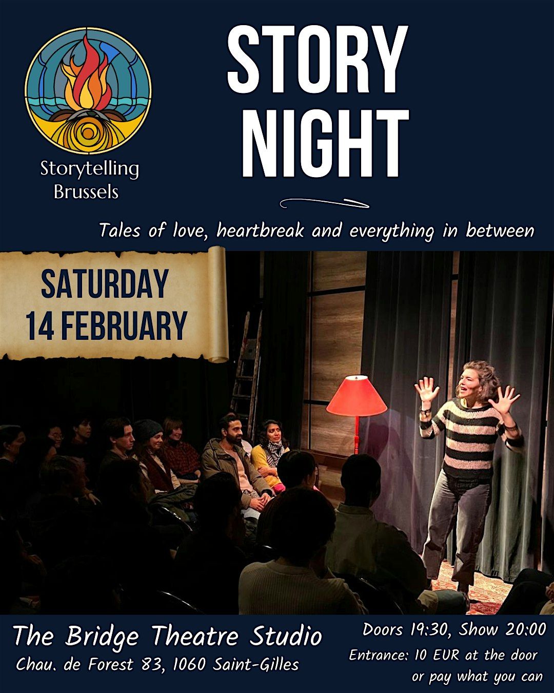 - Doors open 19:30. Show starts at 20:00 (sharp!). More than just a show, we want to create a community around storytelling, so we encourage you to come early, socialize, and maybe meet new people!