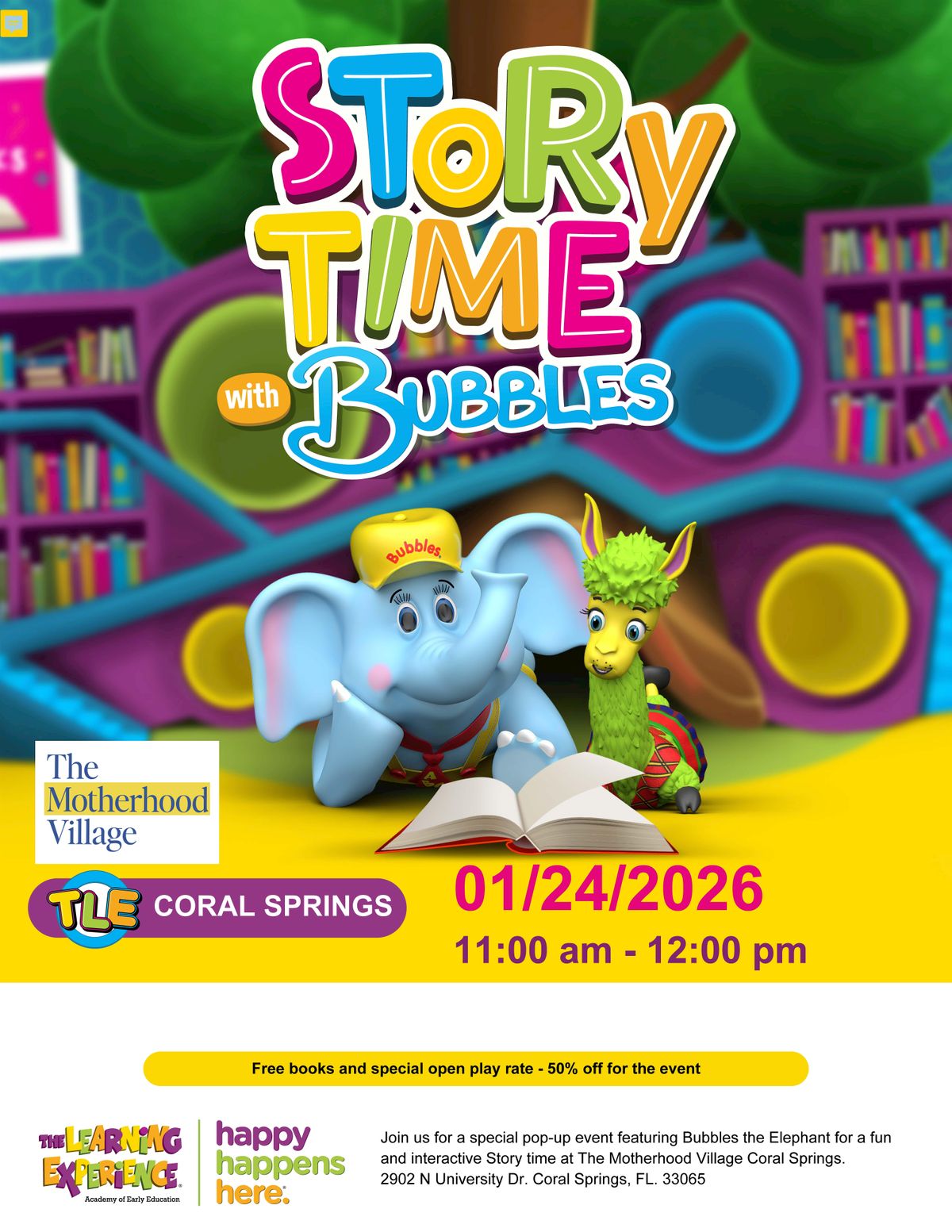 Join us for a special pop-up event featuring Bubbles the Elephant for a fun and interactive story time at The Motherhood Village Coral Springs. We will have free books and a special open play rate 50% off for the event!