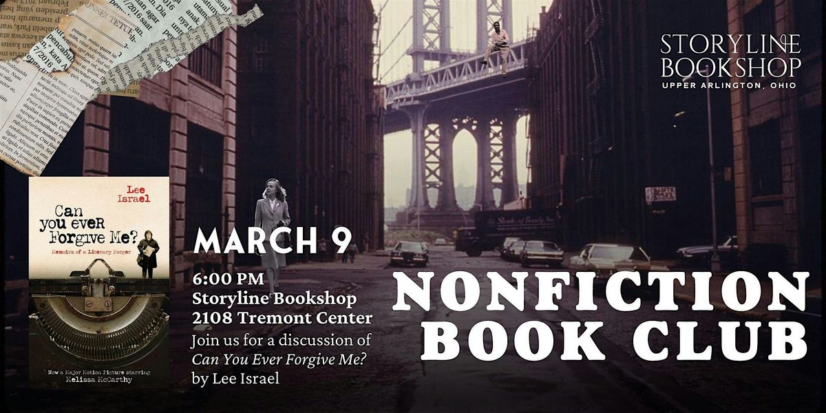 Storyline Bookshop's Nonfiction Book Club is excited to discuss Lee Israel's book Can You Ever Forgive Me?