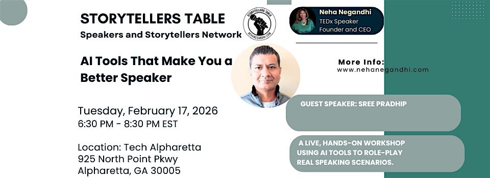 Hands-on Storytellers Table with Neha Negandhi & Guest Speaker Sree Pradhip. Learn AI tools to sharpen stories and speak with confidence.