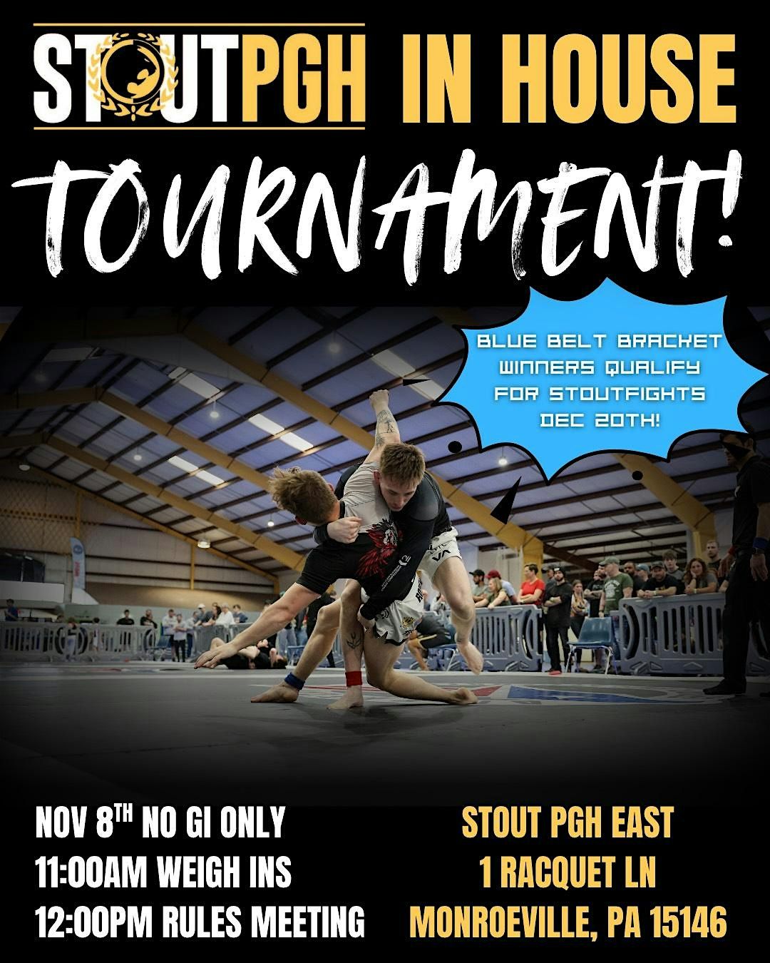 On Nov 8th, 2025 Stout PGH will be hosting another Pittsburgh BJJ NOGI Tournament with men’s & women’s divisions, in beginners (white belts) & for blue belts we will host our Stout Fights Qualifier for Blue Belts for Our Stout Fights Grappling event on Dec 20th, 2025. Purple Brown & Black Belt Competitors can apply directly at stoutfights.com for the September 24th show.