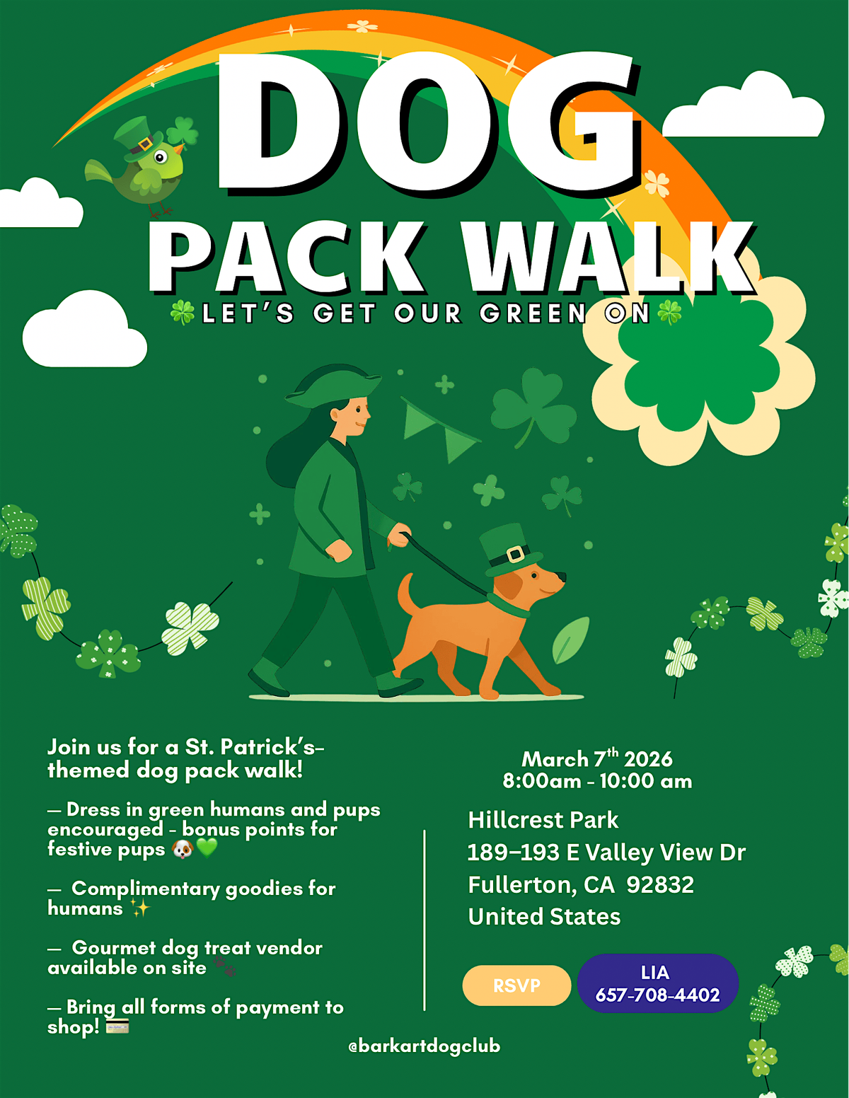 Join us for a St. Patrick’s–themed dog pack walk full of wagging tails, festive vibes, and community fun.
