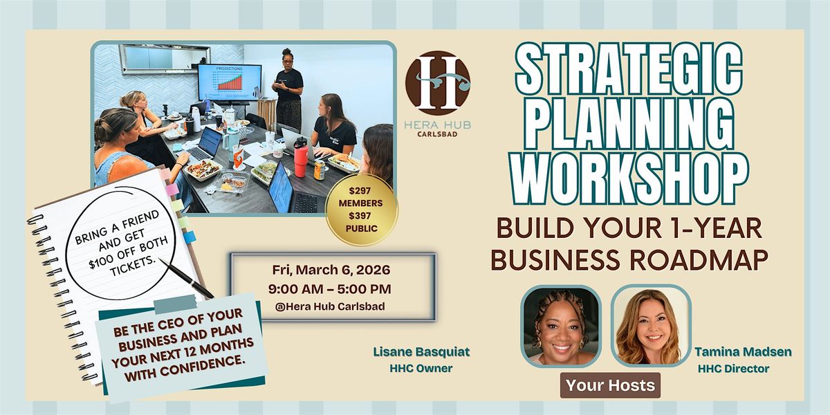 Are you ready to push your business forward with a strategic gameplan in place? This workshop hosted by Hera Hub Carlsbad team Lisane Basquiat and Tamina Madsen is just what you need to set a clear plan for your business growth.
