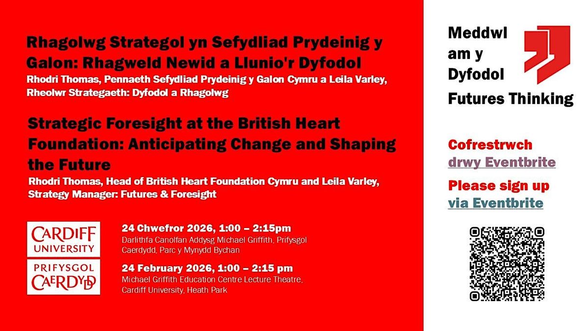 Bydd y drafodaeth yn trin a thrafod y broses o brofi strategaeth newydd Sefydliad Prydeinig y Galon drwy gynllunio senarios, sefydlu rhaglen sganio’r gorwelion ar draws y sefydliad, ac integreiddio rhagolwg i brosesau cynllunio a gwneud penderfyniadau ehangach. Bydd y siaradwyr hefyd yn amlinellu sut mae'r dulliau hyn yn arwain ar feddwl am ddyfodol Sefydliad Prydeinig y Galon Cymru a'i rôl wrth wella iechyd cardiofasgwlaidd am genedlaethau i ddod.