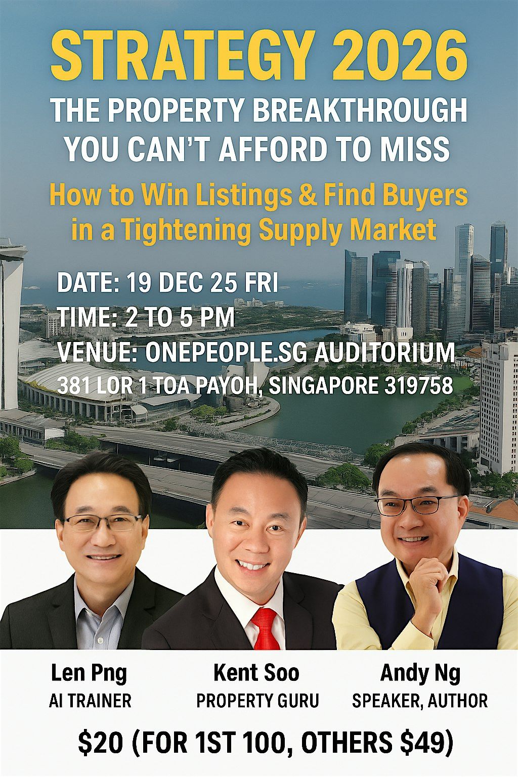 On Friday 23 January 2026, join Real Centre Network and three powerhouse speakers — real estate strategist Kent Soo, AI trainer Leo Png, and best-selling author of Sun Tzu Art of War and Love Intelligence, Andy Ng — for a must-attend transformation afternoon that will reshape how you see and sell property in 2026.