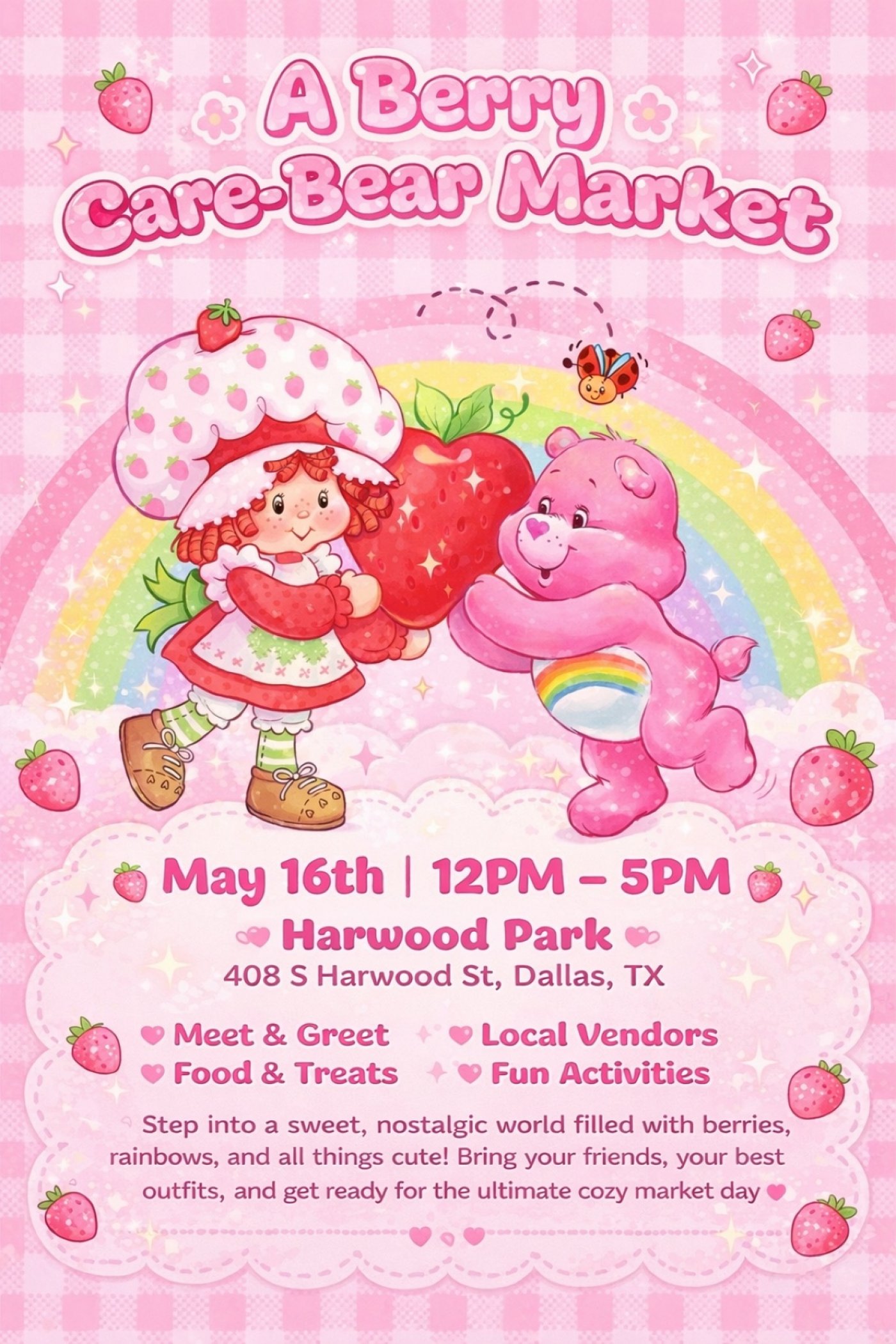 Step into a whimsical world of sweetness and nostalgia at the Strawberry x Carebears Market Mash Up! An enchanting event where beloved characters collide with local vendors, delectable treats, and endless fun.