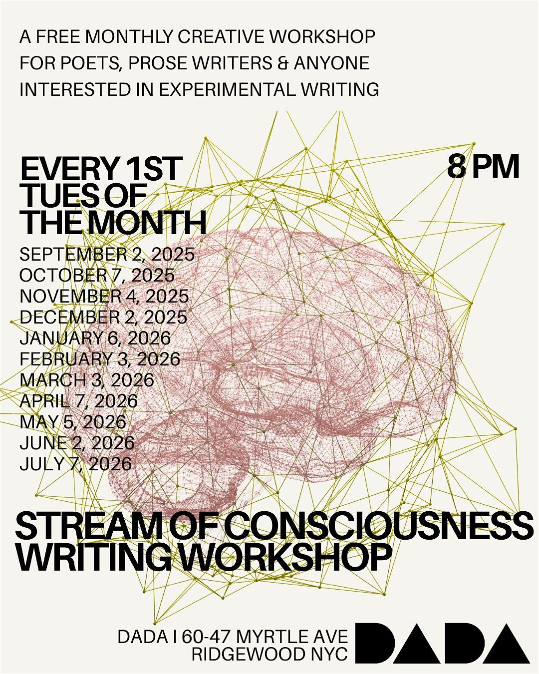 Every 1st Tuesday of the month DADA offers a free in-person stream-of-consciousness creative workshop. We encourage all writers, illustrators, painters and thinkers to gather and let go of any mainstream notions in the spirit of creating spontaneously & unplanned in the moment.