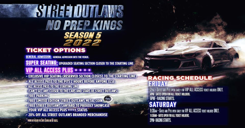 Street Outlaws No Prep Kings returns for its fifth season! See all your favorite drivers LIVE as the battle it out bragging rights and a HUGE cash prize!
