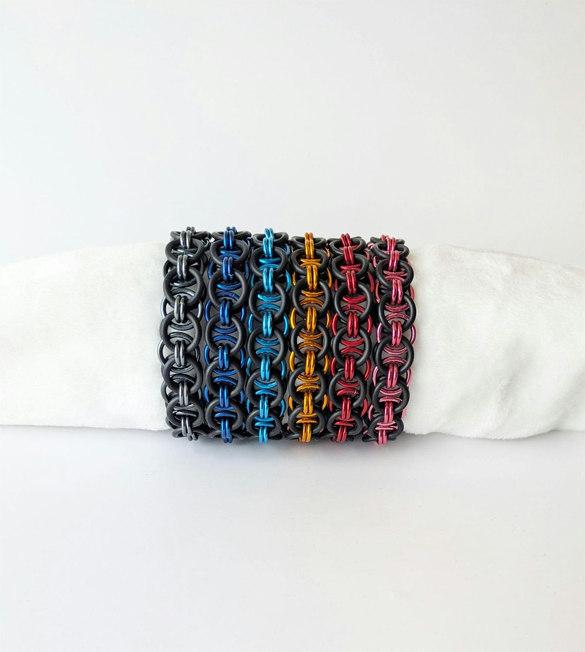 Learn how to use two pairs of pliers to open and close jump rings the correct way. Once you can open and close a jump ring, you can make chainmail! The class walks through the building of a bracelet step-by-step using the "Helm" chainmail weave. The bracelet includes a mix of metal and rubber rings to create a unique piece with stretch, so a clasp is not needed.