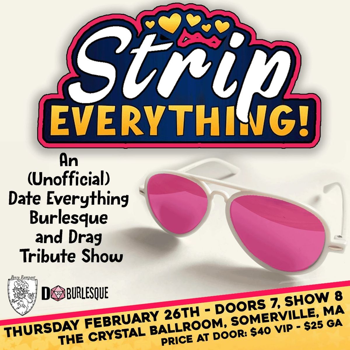 π Welcome to Strip Everything - A Burlesque and Drag Tribute to Date Everything, where dreams come alive and possibilities are endless! ποΈ Join us at Crystal Ballroom at Somerville Theatre in the heart of Somerville, MA for an event that defies expectations. π