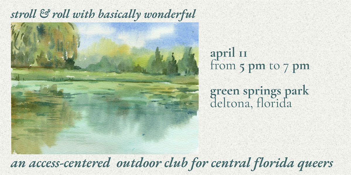 Stroll and roll with Basically Wonderful at Green Springs Park on Saturday, Aprill 11 from 5pm to 7pm! Join us for a relaxing evening amongst nature and good company as we explore the springs & picnic at the park together.