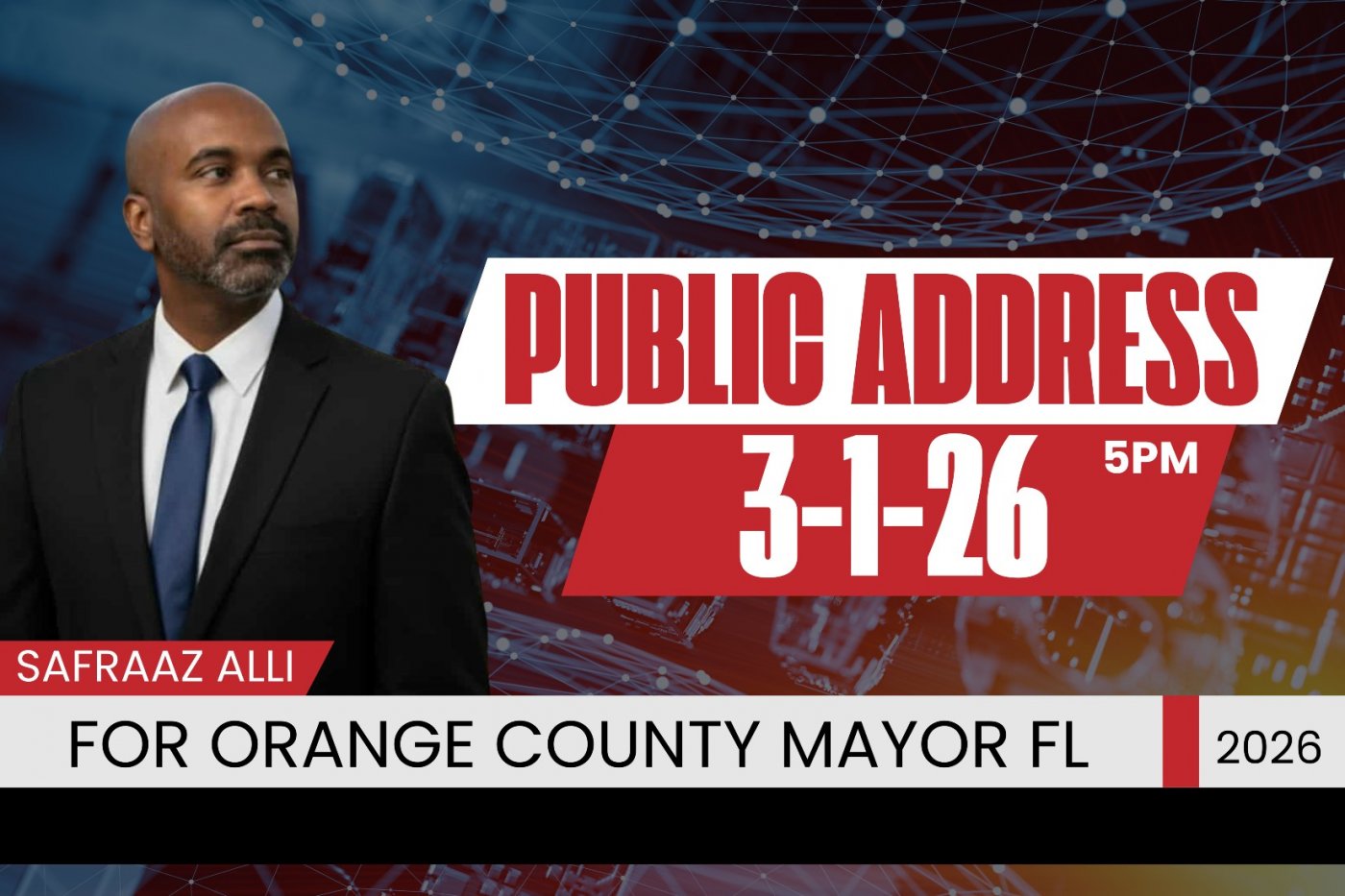 Residents across Orange County are invited to attend a community address featuring candidate for Orange County Mayor Safraaz Alli, who will speak about some of the most pressing issues facing the region today. This event is designed to bring neighbors together for an open, solutions‑focused conversation about challenges such as homelessness, affordable housing, transportation access, public safety, and the long‑term well‑being of families throughout Central Florida.