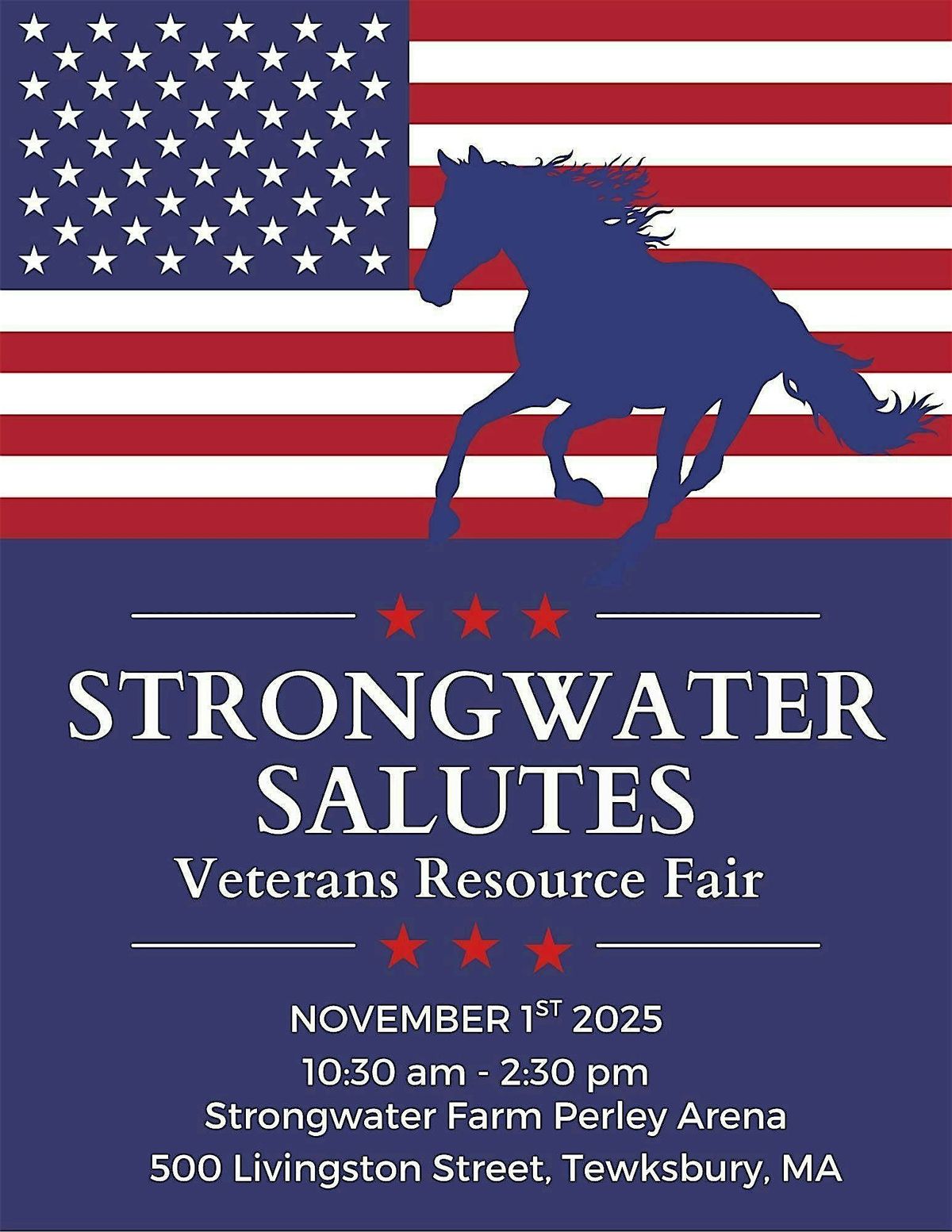 Strongwater Farm, known for its impactful equestrian assisted services for veterans and other members of our community, recognizes the diverse needs of our veteran community that extend beyond our direct offerings. In an effort to address these broader needs, we are excited to host the Strongwater Salutes Veterans Resource Fair at our spacious indoor arena.