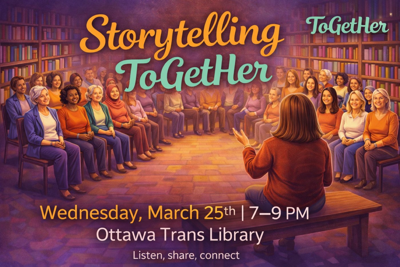 Our first story tellers get ToGetHer on WEDNESDAY, MARCH 25TH, 7PM - 9PM, at THE OTTAWA TRANS LIBRARY, 1104 SOMERSET ST W, OTTAWA. DOORS OPEN AT 7PM. ADMISSION $10/PERSON