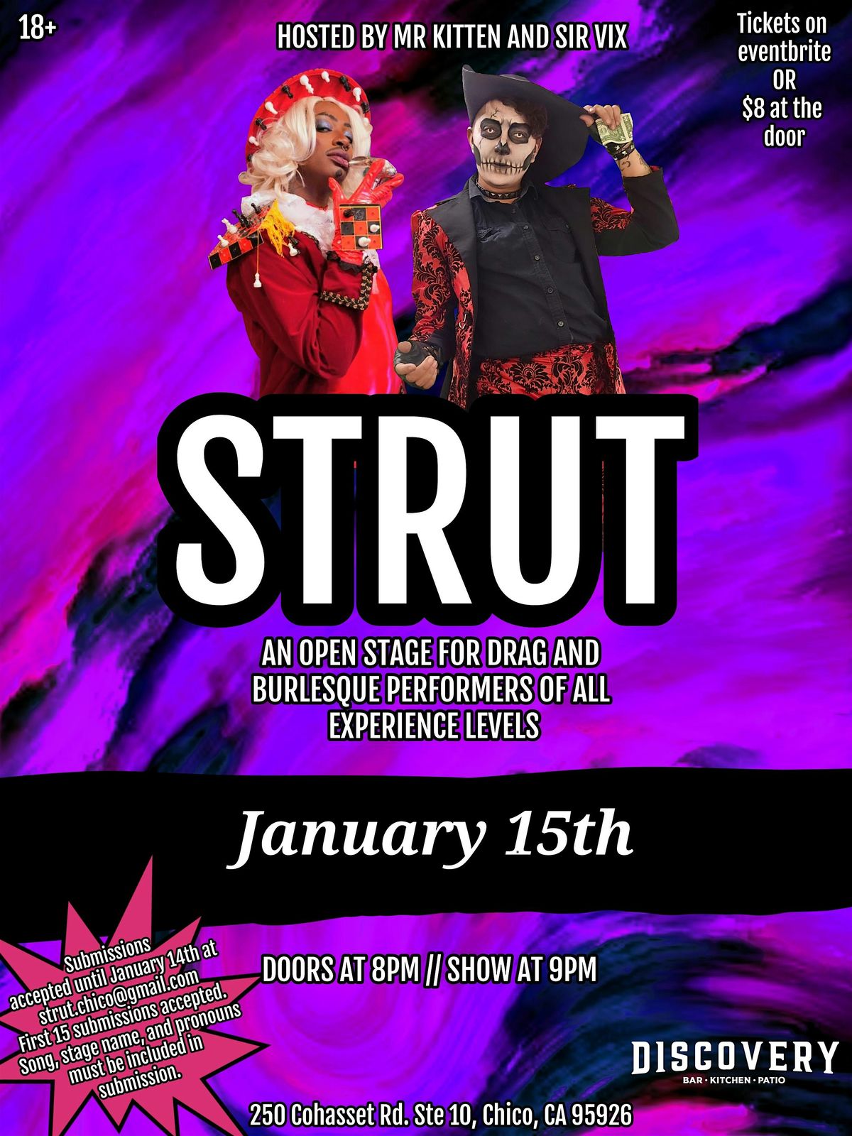 Welcome to Strut! a drag and burlesque open stage for performers of all experience levels hosted by Mr Kitten and Sir Vix!