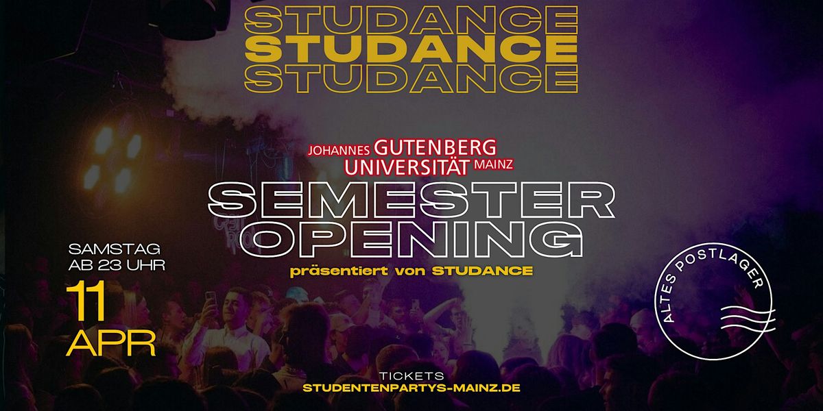 Am Freitag, den 11. April 2026, starten wir ab 23:00 Uhr im Alten Postlager auf 2 Floors mit der großen STUDANCE Semester Opening Party ins Sommersemester – mitten in der Ersti-Woche der JGU Mainz.