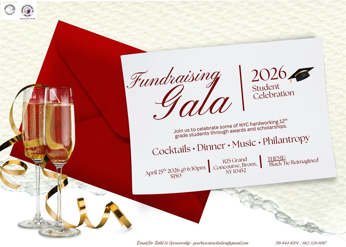 Join us for an unforgettable evening of purpose and celebration at The Goodnews to Scholars Fundraising Gala. Enjoy delicious cuisine, inspiring student performances, and music as we come together to raise critical scholarship funds for students from low-income and immigrant families across NYC. Every ticket and donation helps open doors to college and trade school, turning dreams into degrees and skills into opportunities. Your presence helps fuel education, opportunity, and brighter futures for the next generation. One night, Lasting impact.