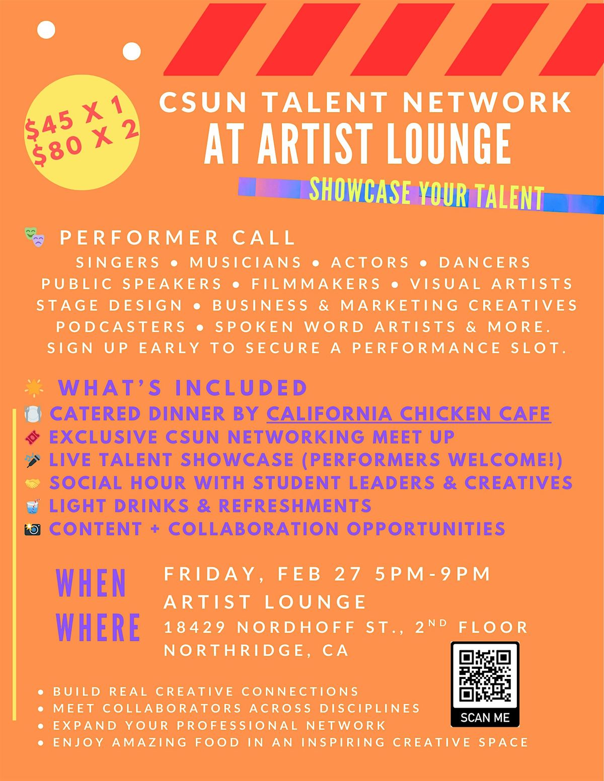 Join us for an unforgettable evening bringing together the brightest creatives from California State University, Northridge at Artist Lounge. This event is open to College Students and Professionals.
