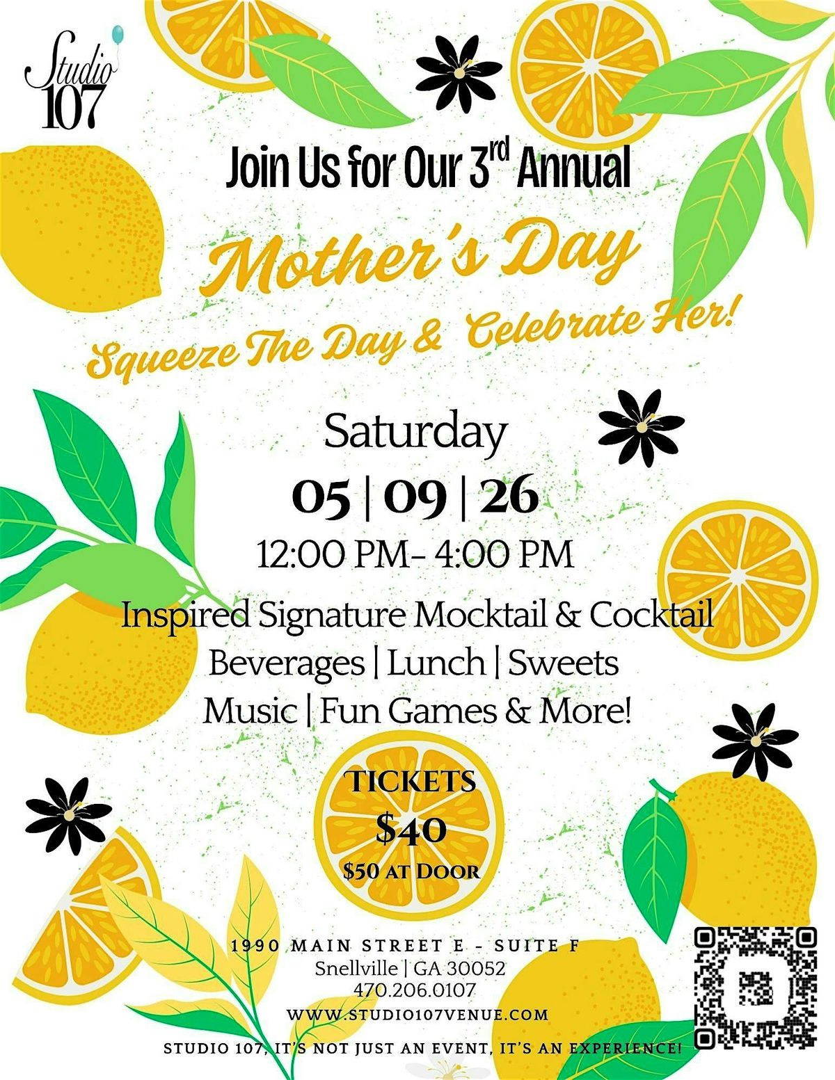 Come Celebrate HER & Squeeze the Day at our 3rd Annual Mother's Day Event at Studio 107! Step into a bright, lemon inspired atmosphere were we'll delight in lunch, sweets and unlimited inspired beverages, including a signature mocktail & signature cocktail.