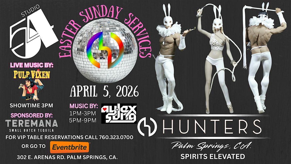 - STUDIO 54 EASTER SUNDAY SERVICE Step into the disco dream this Easter at Hunters Palm Springs — the #1 Voted Nightclub three years running (2024, 2025 & 2026)! Sunday, April 5, 2026 Where glam meets gospel, disco meets diva, and the party NEVER stops! LIVE ON STAGE: The iconic fan favorite — Pulp Vixen Showtime: 3PM–5PMBringing powerhouse vocals, legendary hits, and pure Studio 54 energy! DJ Aylex Song spinning the vibes 1PM–3PM & 5PM–9PMKeeping you dancing from day into night! Craft cocktails flowing — Bloody Marys, Margaritas & Martinis Pride Pie, juicy burgers & delicious bites served hot Not your average Easter… this is a full-on disco revival in the heart of the Arenas District! 302 E. Arenas Rd, Palm Springs, CA VIP Table Reservations: 760.323.0700 or go to Eventbrite. HuntersPalmSprings.com Worship the music. Praise the queens. Live your disco fantasy. Dress to Impress your favorite Disco attire!Sponsored by: Teremana, Small Batch Tequila#huntersps #studio54vibes #easterparty #sundayfunday #arenasdistrict #palmspringsnightlife #lgbtqevents