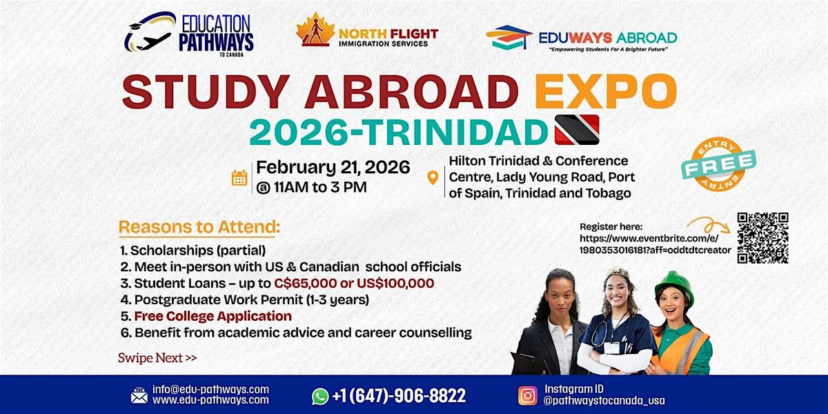 Get ready for the ultimate study abroad experience happening right in Trinidad! This is your chance to meet top universities, chat with experts, and discover amazing opportunities to study overseas. Whether you’re dreaming of Europe, the USA, or beyond, come explore your options in person and get all your questions answered. Don’t miss out on making your international education dreams come true!