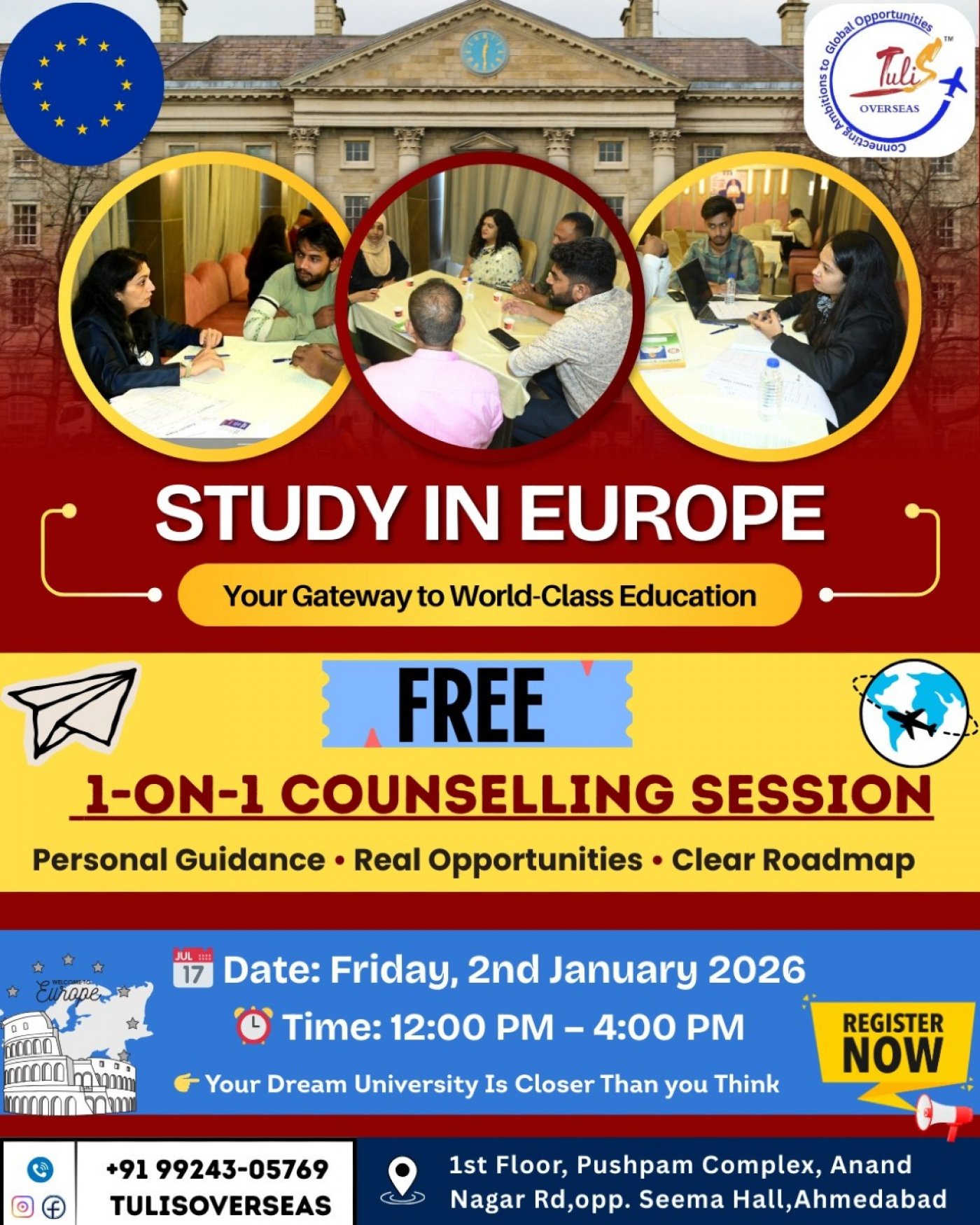 #StudyInEurope #StudyAbroad #FreeCounselling #StudyInEurope2026 #TulisOverseas #Ahmedabad #EducationFair #DreamUniversity #StudyVisa #EuropeEducation #StudentLife #ScholarshipOpportunity #CounsellingSession