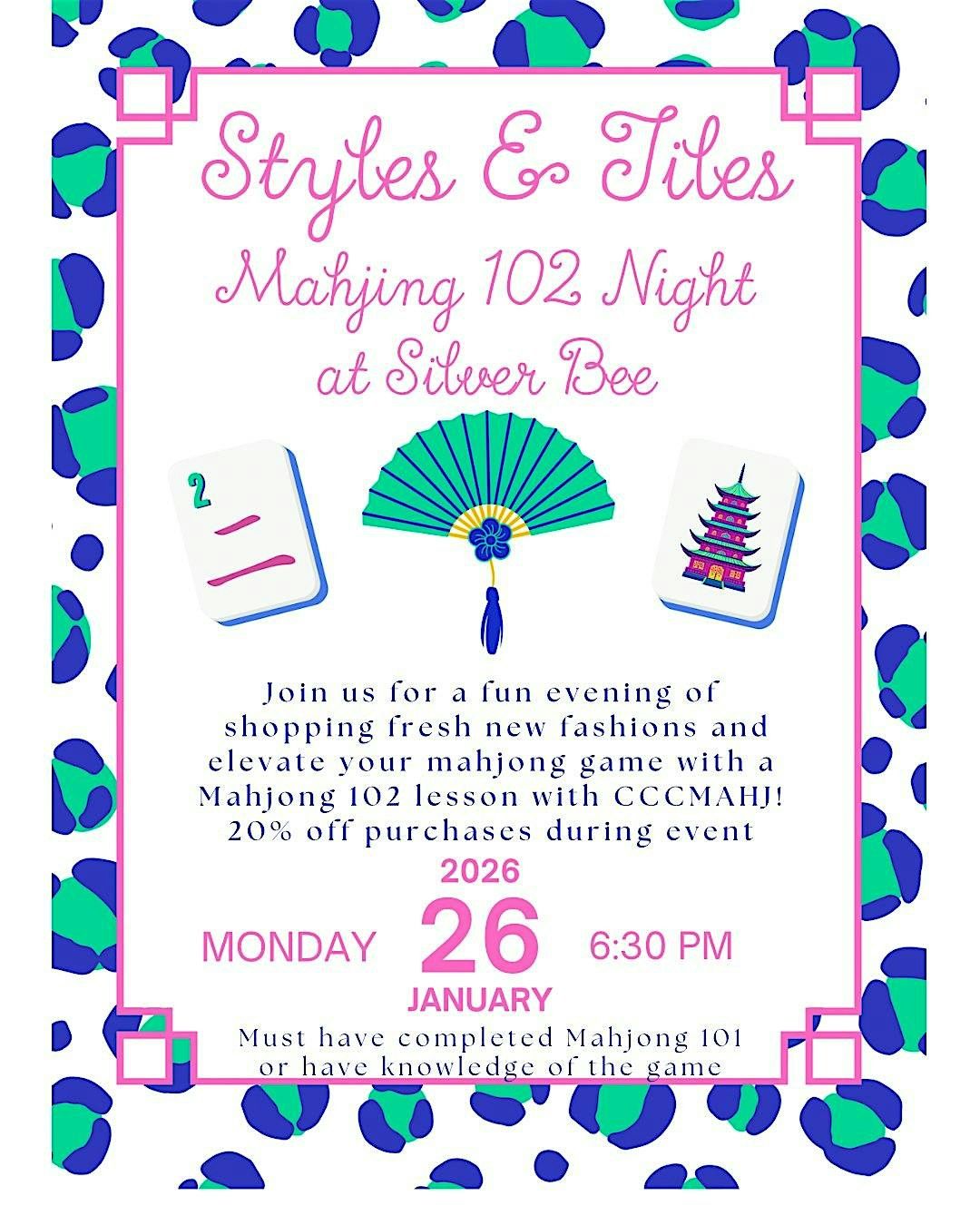 Rwady to level up your fashion and mahjong game for 2026? Courtney Cook, CCCMAHJ, will be here Monday, January 26, to continue our mahjong classes with Mahjong102. We will go over strategy, more in depth review of the card and rules to get you ready to play independently. Enjoy 20% off purchases during event!