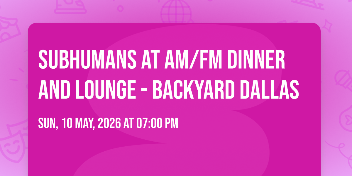 ✨ Discover the extraordinary at Subhumans at AM/FM Dinner and Lounge - Backyard Dallas, where magic meets reality in ways you've never imagined! 🏛️ Set in AM/FM Dinner and Lounge - Backyard Dallas nestled in bustling Dallas, TX, this event promises to be a landmark occasion. 📅 Taking place on May 10th, 2026 at 07:00 PM, it's going to create an atmosphere where every moment becomes a cherished memory. 🌟 Immerse yourself in an experience crafted with attention to every detail, designed to surprise and delight at every turn. They have worked tirelessly to ensure this event exceeds all expectations, bringing together elements of entertainment, innovation, and pure joy. 🎊 Don't miss your chance to be part of this remarkable journey!