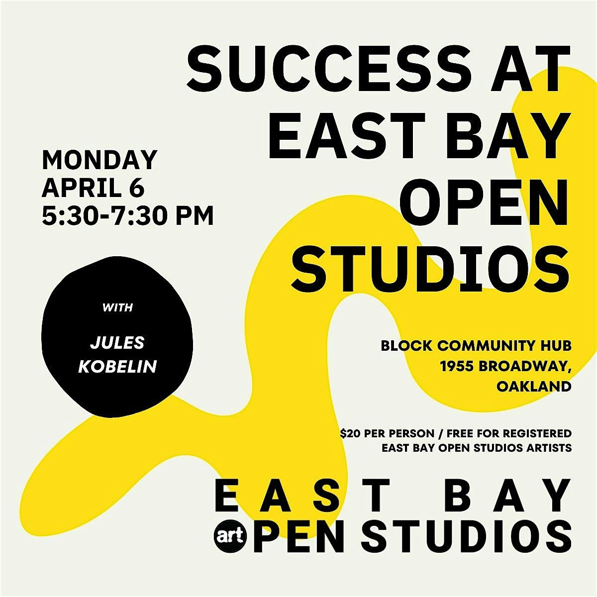 Join us for an in-depth workshop on how to achieve success during East Bay Open Studios. Hosted by EBOS artist Jules Kobelin, this workshop is designed to help EBOS participants explore their own pathways to achieving their personal version of success.