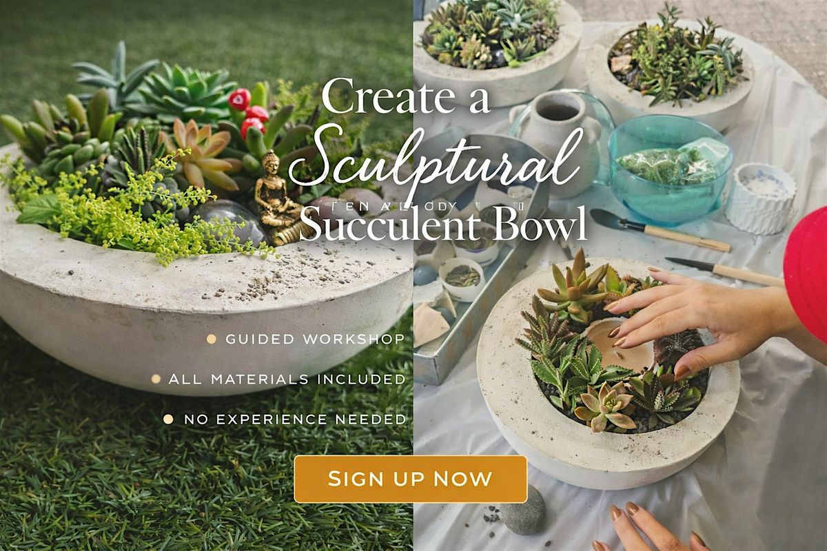 Participants will select a collection of succulents and decorative elements to create a one-of-a-kind living masterpiece in a gorgeous hand-made cement bowl.