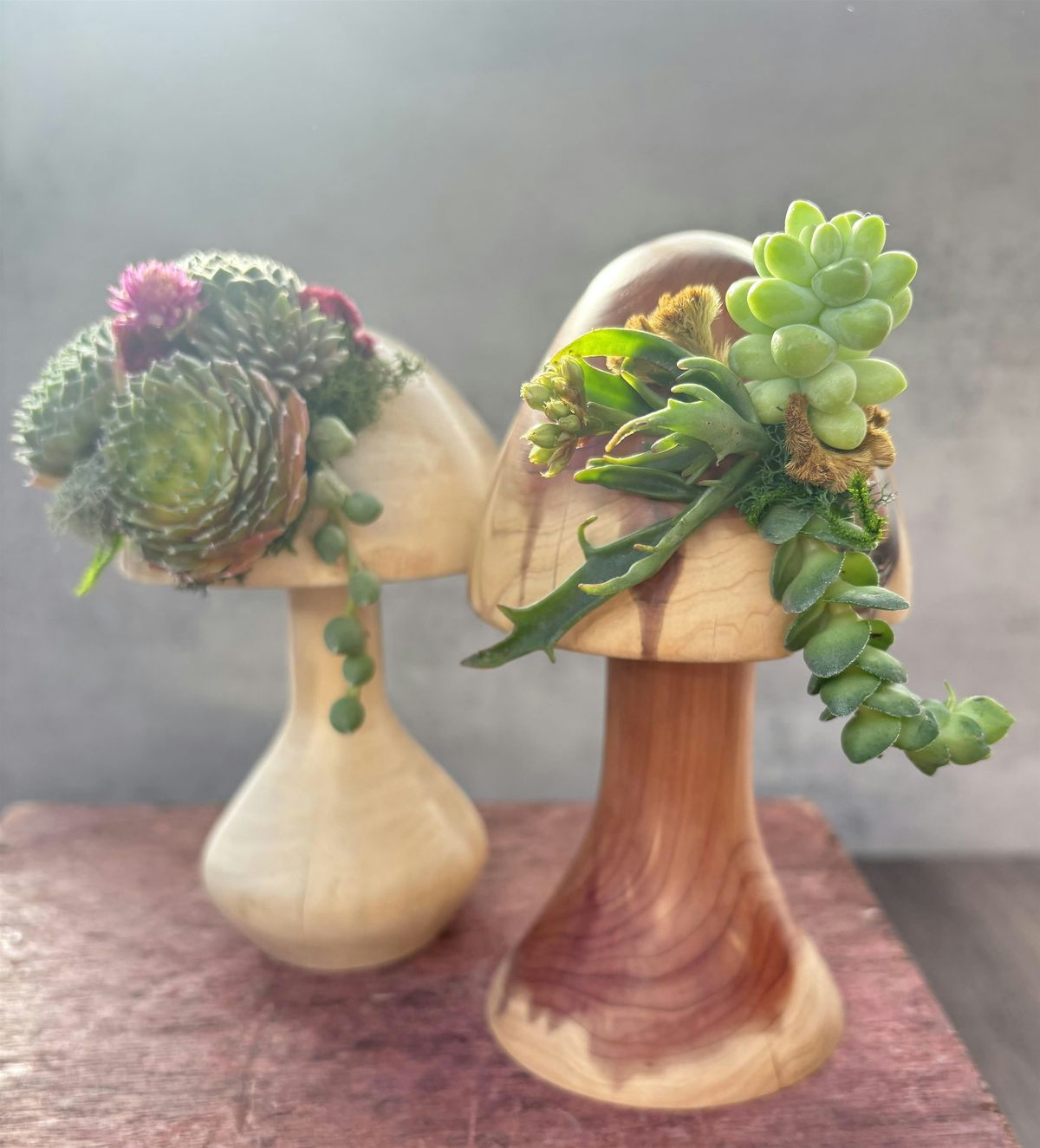 Join Rusted Rabbitt Living Designs for a hands-on living art experience where you’ll create a whimsical succulent mushroom sculpture built on a handmade, hand-turned wooden mushroom form created by Rusted Rabbitt. Each piece becomes a one-of-a-kind botanical artwork combining natural materials with living succulents.
