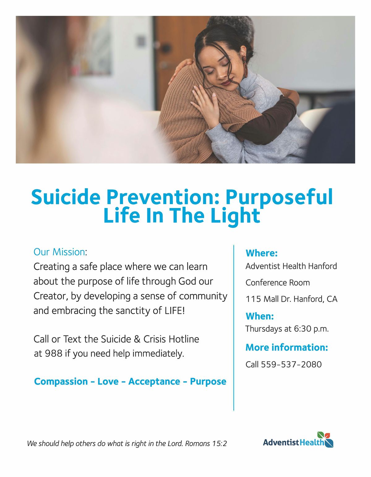 Come join us for our Suicide Prevention Support Group at Adventist Health Hanford located in Conference Room between Maternity & Main Hospital enterance. This event aims to provide a safe space for individuals struggling with thoughts of suicide. Together, we will share experiences, offer support, and learn coping strategies to live a more purposeful life in the light. You are not alone - let's walk this journey together.