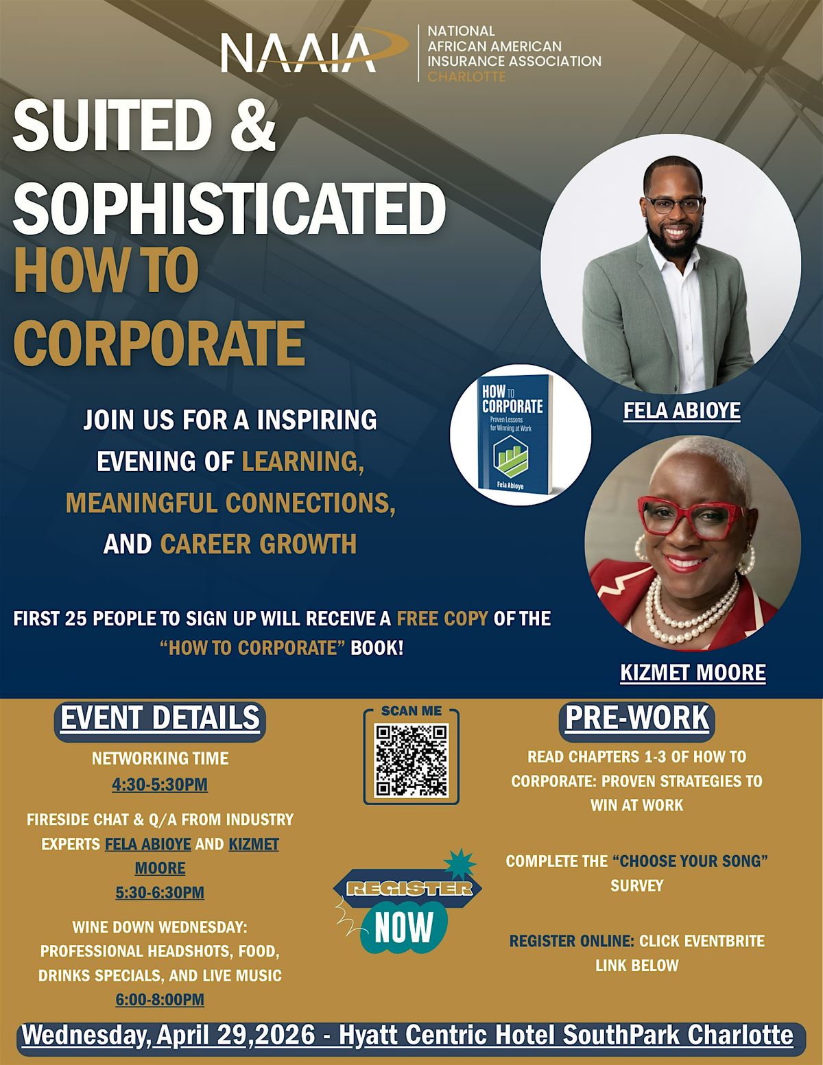 The NAAIA Charlotte chapter is happy to host the traveling author Fela Abioye for his How to Corporate series, this time with a twist! We are teaming up with IRO Southpark--based in Hyatt Centric Southpark--to maximize this evening of professional empowerment. Start the evening with our How to Corporate disucssion and end with Wine Down Wednesdays in partnership with IRO Southpark. See below for more details!