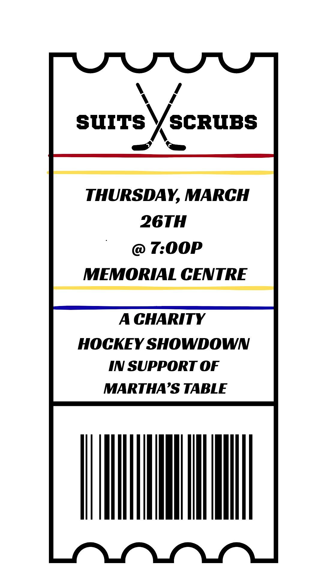 Get ready for a fun night at the Kingston Memorial Centre on March 26, 2026 at 7:00 PM (ET)! Join us for the Suits and Scrubs Charity Hockey Showdown, where local law and medical students hit the ice for a great cause. All proceeds are in support of Martha's Table in Kingston. Don’t miss out on the excitement and the chance to support a great community organization in a relaxed and friendly atmosphere!