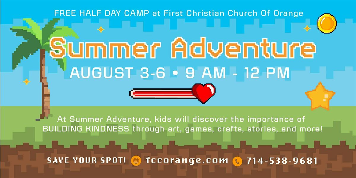 Kids ages 4 - incoming 6th grade are invited to join us for Summer Adventure Half-Day Camp at First Christian Church of Orange! Summer Adventure will run the week of August 3-6th from 9am-12:00pm, and it is FREE!