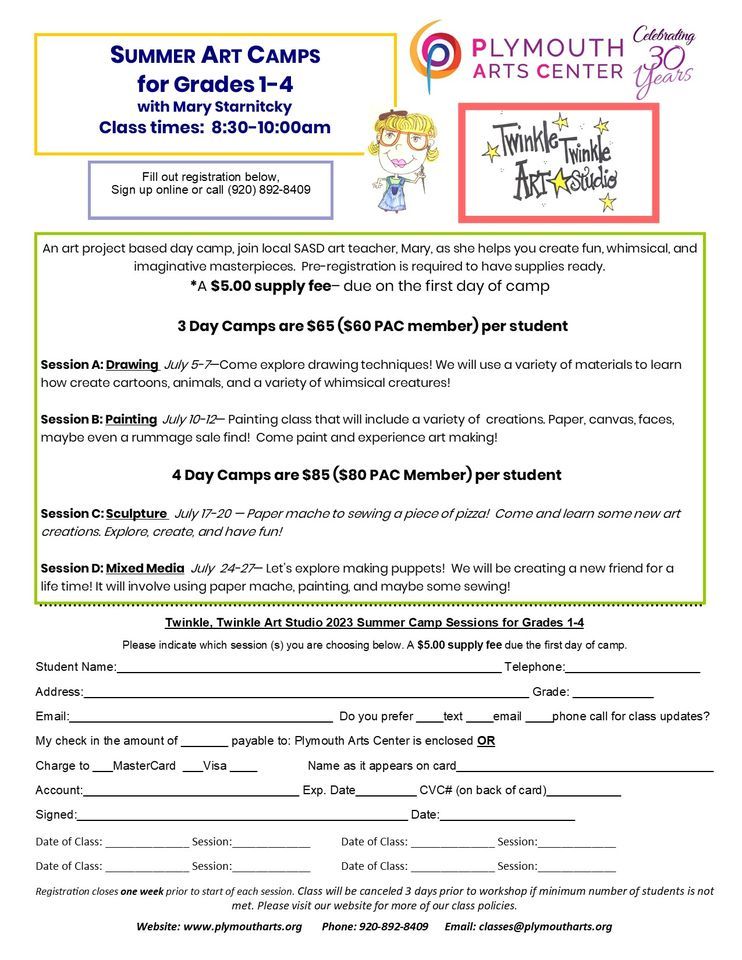An art project-based day camp, join local SASD art teacher, Mary, as she helps you create fun, whimsical, and imaginative masterpieces. Pre-registration is required to have supplies ready. *A $5.00 supply fee– due on the first day of camp3 Day Camps are $65 ($60 PAC member) per student