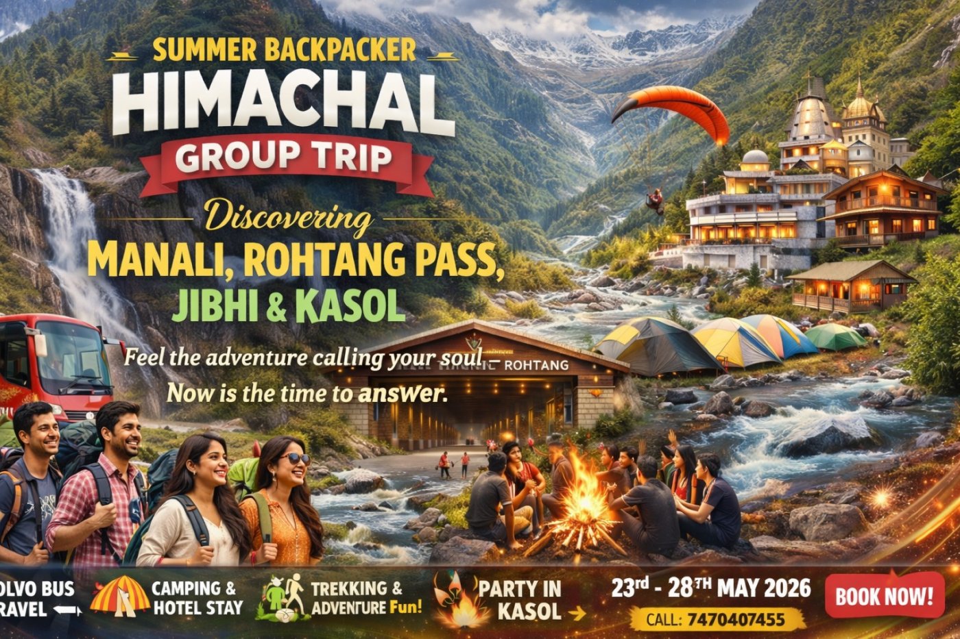 Backpacker Himachal Group Trip To Manali Kasol Manikaran, Sishu Village, Jalori Pass, Atal Tunnel, Jogni Waterfall, & Solang Valley ex-Delhi And Connected Easy Transportation From 5 Departure Places Indore, Jaipur, Bhopal, Ahmedabad & Kolkata..