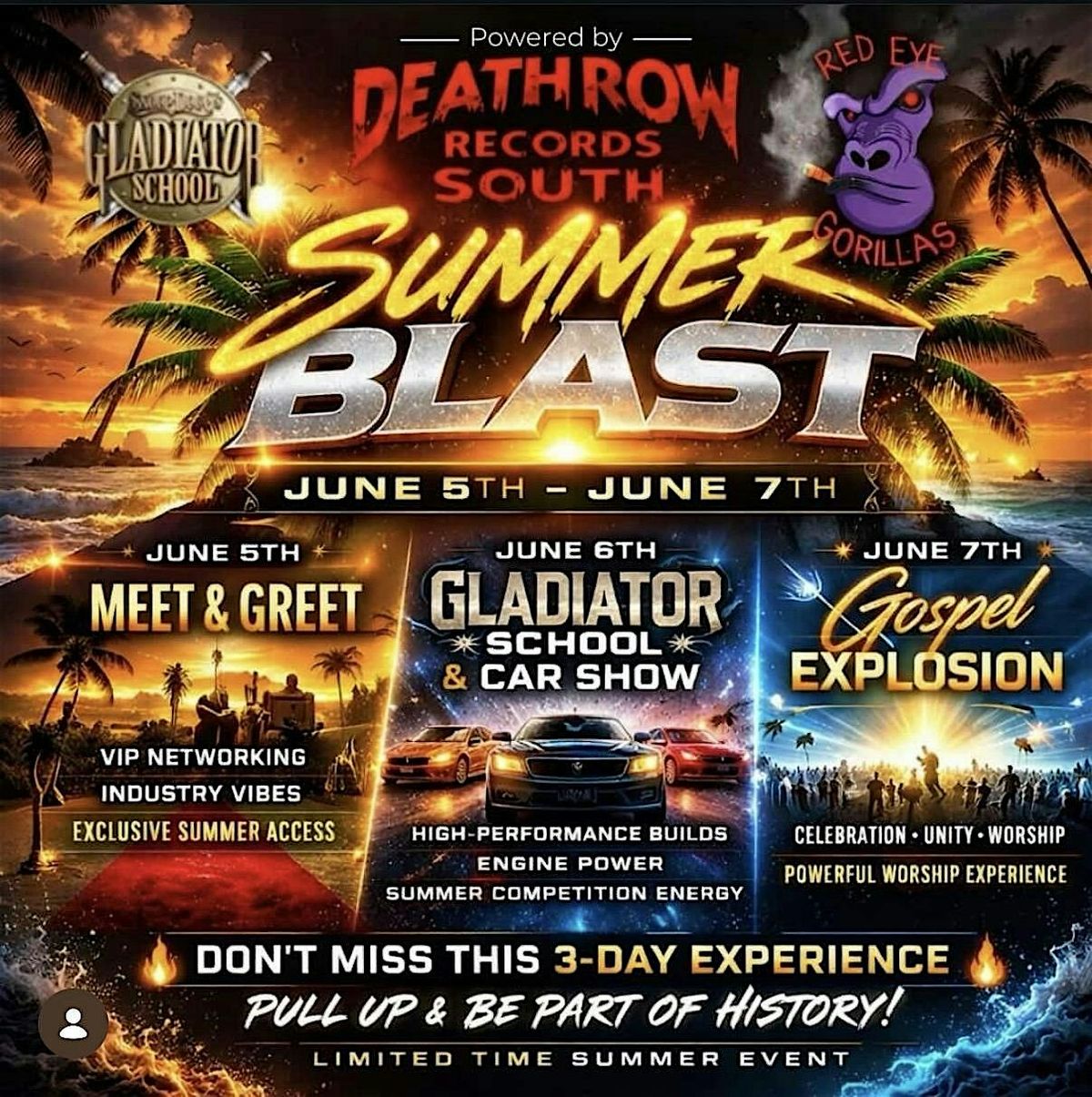 Get ready for an unforgettable in-person experience! Join us at Summer Blast where Deathrow Records Juice The Producer, Emak & Red Eye Garillas Bring you an Epic weekend. Don't miss out on the vibes, beats, and good times this summer! It's all happening live—come through and feel the energy!