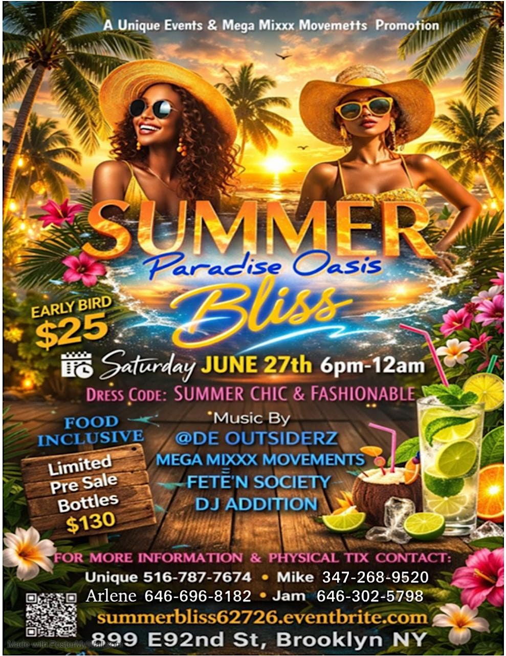 Welcome to Summer Bliss 2026: “Paradise Oasis” . A chic and mature atmosphere that highlights hand crafted cocktails/drinks, mouth watering entrées and the wonderful sounds of summer fun curated by live djs. The only missing component is you!!! Summer Bliss 2026: Paradise Oasis.