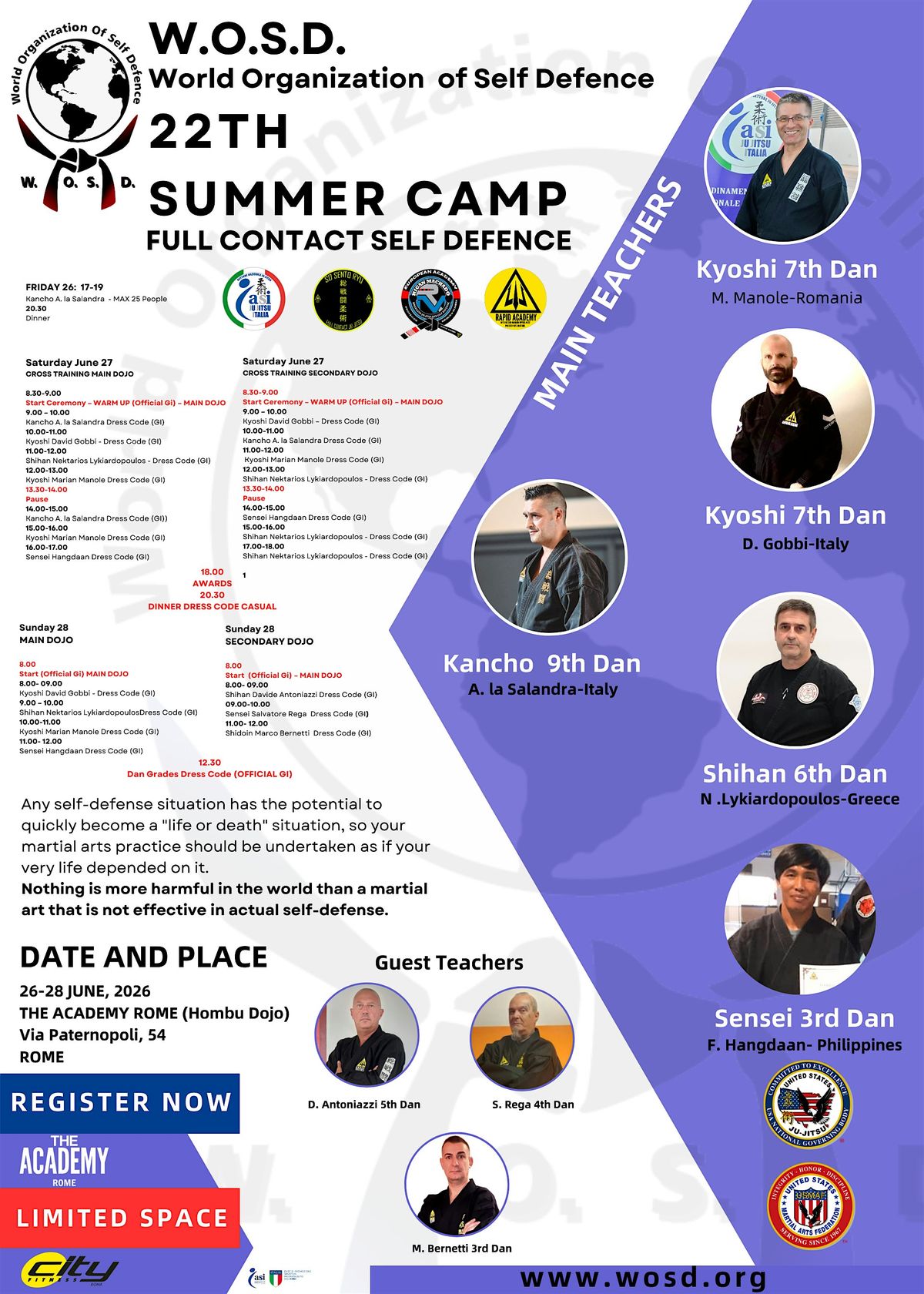 From June 26β28, 2026, the World Organization of Self Defence brings you three days of high-level training, international instructors, and real Full Contact Self Defence.