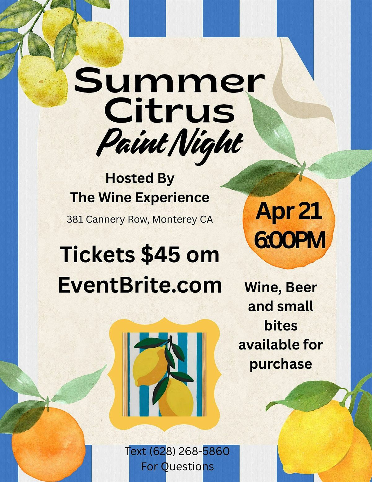 Get ready for a fun-filled evening of creativity and sunshine vibes! Join us in person for the Summer Citrus Paint Night at The Wine Experience, where you'll sip, paint, and laugh while crafting your very own citrus-inspired masterpiece. No experience needed—just bring your good vibes and get ready to unleash your inner artist. Perfect for friends, dates, or solo trips to meet new people. Don't miss this juicy, colorful night out!