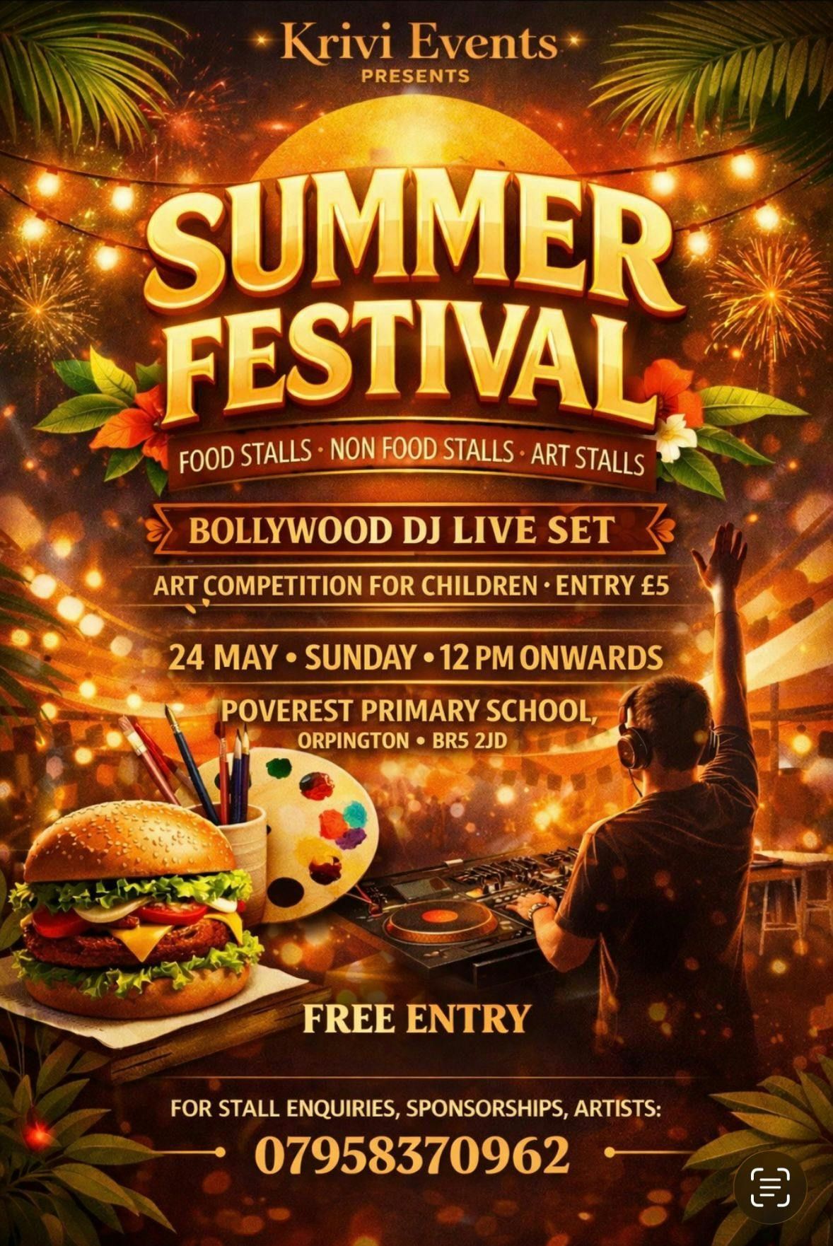 Join us to welcome the summer in UK with the SUMMER FESTIVAL in Orpington on 24 May'26, Sunday, 12 pm onwards. This event is free for visitors. We will have Food stalls, Non Food Stalls, Art stalls. Additionally we will have an ART COMPETITION for Children (40 entries) at 1 pm for which the contestants have to purchase an entry to the competition for £5. Stall Fees - £60This is not all, there will be music too. A Live Bollywood DJ set will be played from 2 pm to 4 pm for people to dance and party. What more can anyone ask for a relaxed Sunday. Great food, shopping, music! Free registration on Fatsoma.
